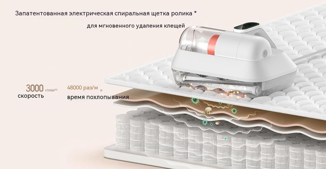 Пылесос Xiaomi Mijia Mite Removal Device Pro (B402CN) — это ручной пылесос для удаления пылевых клещей, аллергенов и пыли с ваших кроватей, диванов и любой мягкой мебели. Роликовая щетка вращается с высокой скоростью - 3000 об/мин и создает вибрацию до 48000 уд/мин, а спиральное расположение щетинок обеспечивает бережную очистку тканевой поверхности. Также Mijia Mite Removal Device Pro имеет ультрафиолетовую лампу для уничтожения различных микробов. Лампа излучает свет 254 нм, выполняя функцию уничтожение микроорганизмов и бактерий. Пылесос оснащен двигателем мощностью 400 Вт и силой всасывания 14000 Па. Такая сила удалит всю пыль и грязь из ткани. Устройство будет полезно как аллергикам, так и любителям идеальной чистоты в доме.