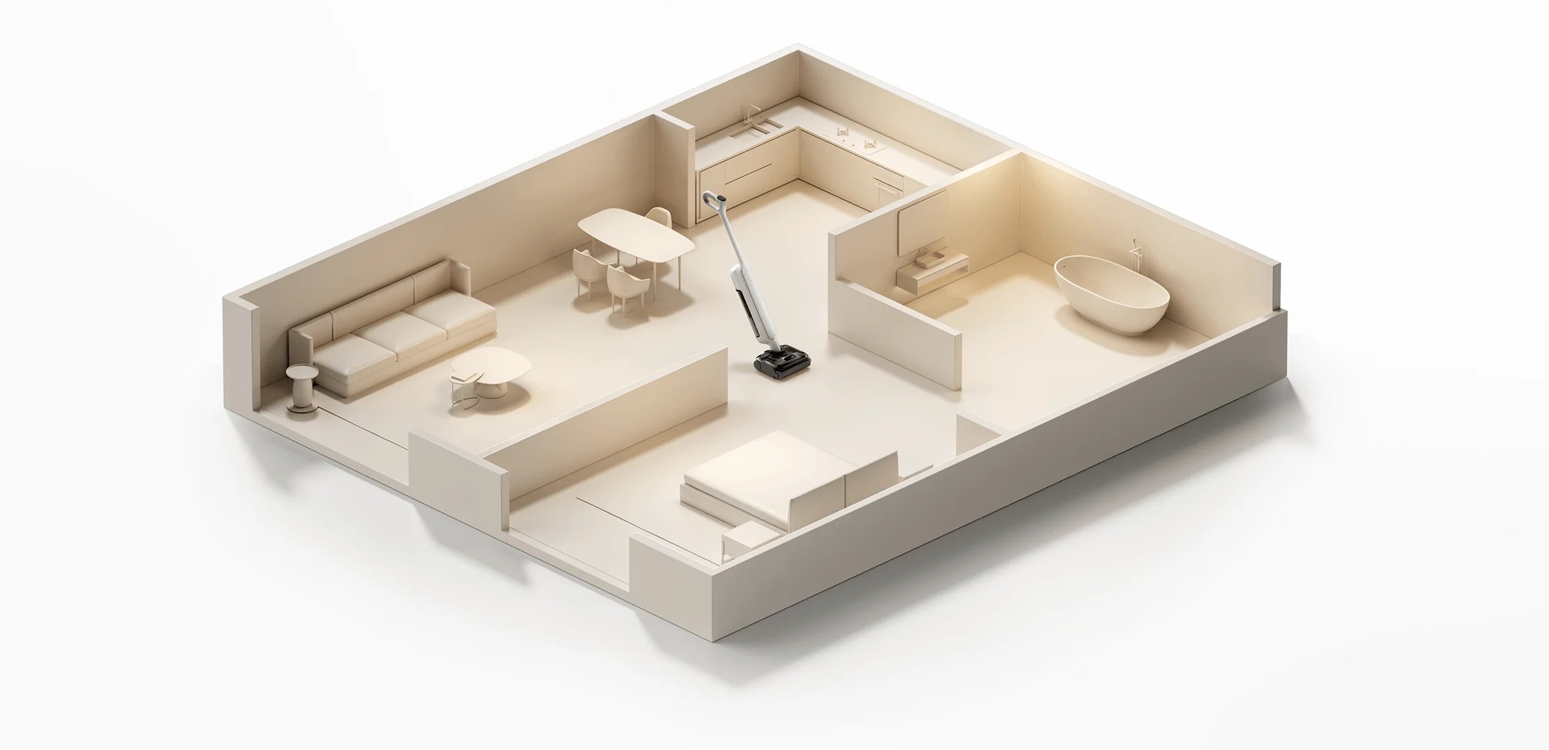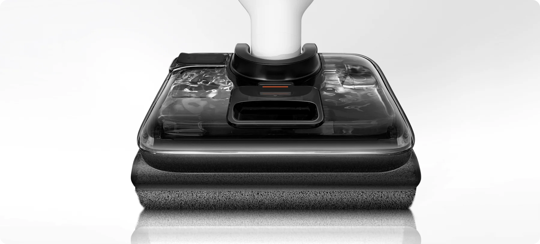 Пылесос развивает силу всасывания до 18 000 Па, чего достаточно для удаления как мелкой пыли, так и более плотных загрязнений. Роликовая турбощётка активно работает по всей ширине уборки, плотно прижимаясь к полу, что помогает эффективно собирать грязь и влагу. При необходимости мощность автоматически адаптируется под тип поверхности, а на коврах усиливается для более глубокой очистки.