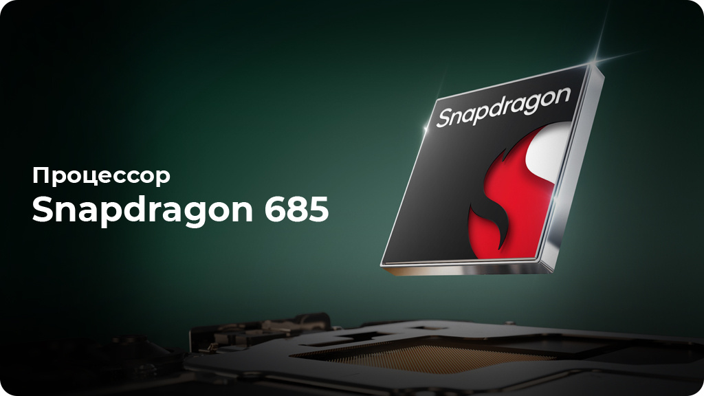 Смартфон имеет процессор 2023 года Snapdragon 685. Бюджетный чип обеспечивает стабильную работу в многозадачном режиме, совместим с камерой 108 Мп, экраном 120 Гц и Wi-Fi 5. Процессор энергоэффективен — он экономно распределяет ресурсы между задачами, чтобы увеличить время работы смартфона.