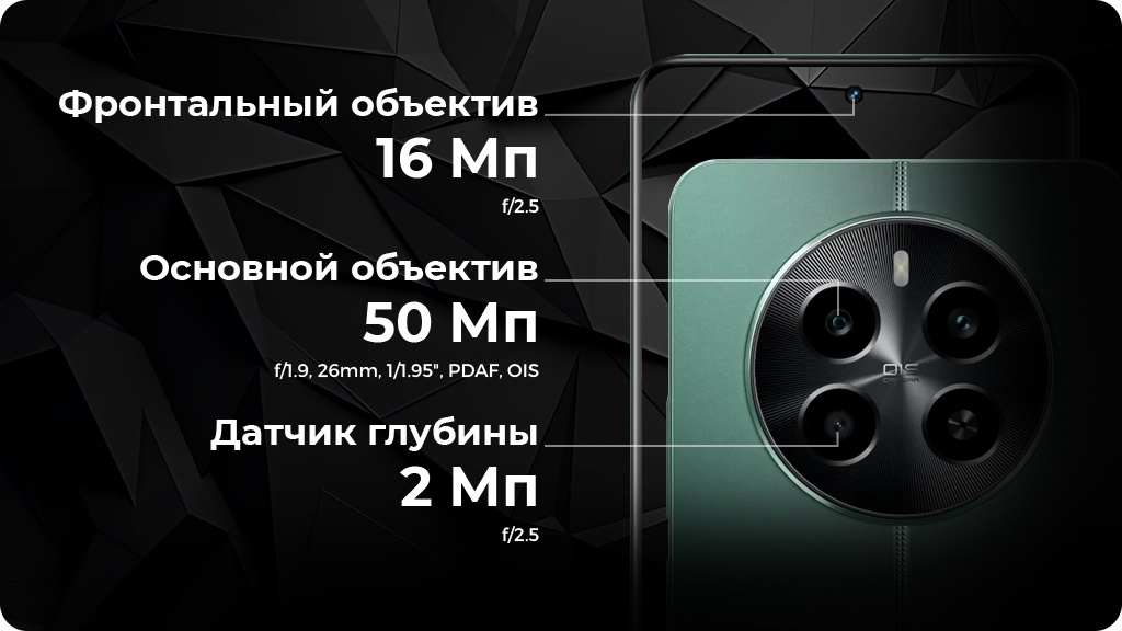Realme 12 4G получил основную камеру от Sony. Это объектив 50 Мп, к нему идет вспомогательный датчик 2 Мп. Фронтальная камера снимает с разрешением 16 Мп. Смартфон получил алгоритм для различных фокусных расстояний, разработанный совместно с Qualcomm — MasterShot Algorithm. Кроме того, у realme 12 4G есть оптическая и цифровая стабилизация. С ними не составит труда сфокусировать камеру, чтобы сделать четкий детализированный кадр или плавное видео в движении.