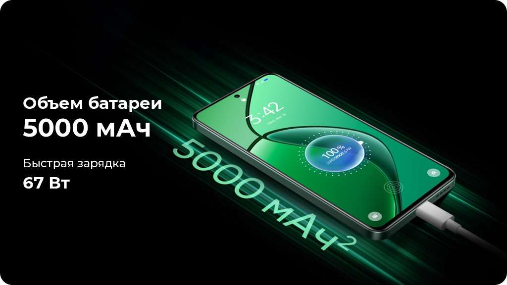 В режиме разговора заряда хватит на 33 часа, просмотра видео — на 15 часов. При умеренной нагрузке автономность realme 12 4G составит до двух с половиной дней, а при активном использовании, с интернетом, играми, просмотром видео — один день. На зарядку от 0 до 100% уйдет около 50 минут. Это возможно благодаря быстрой зарядке 67 Вт, которую поддерживает realme 12 4G.